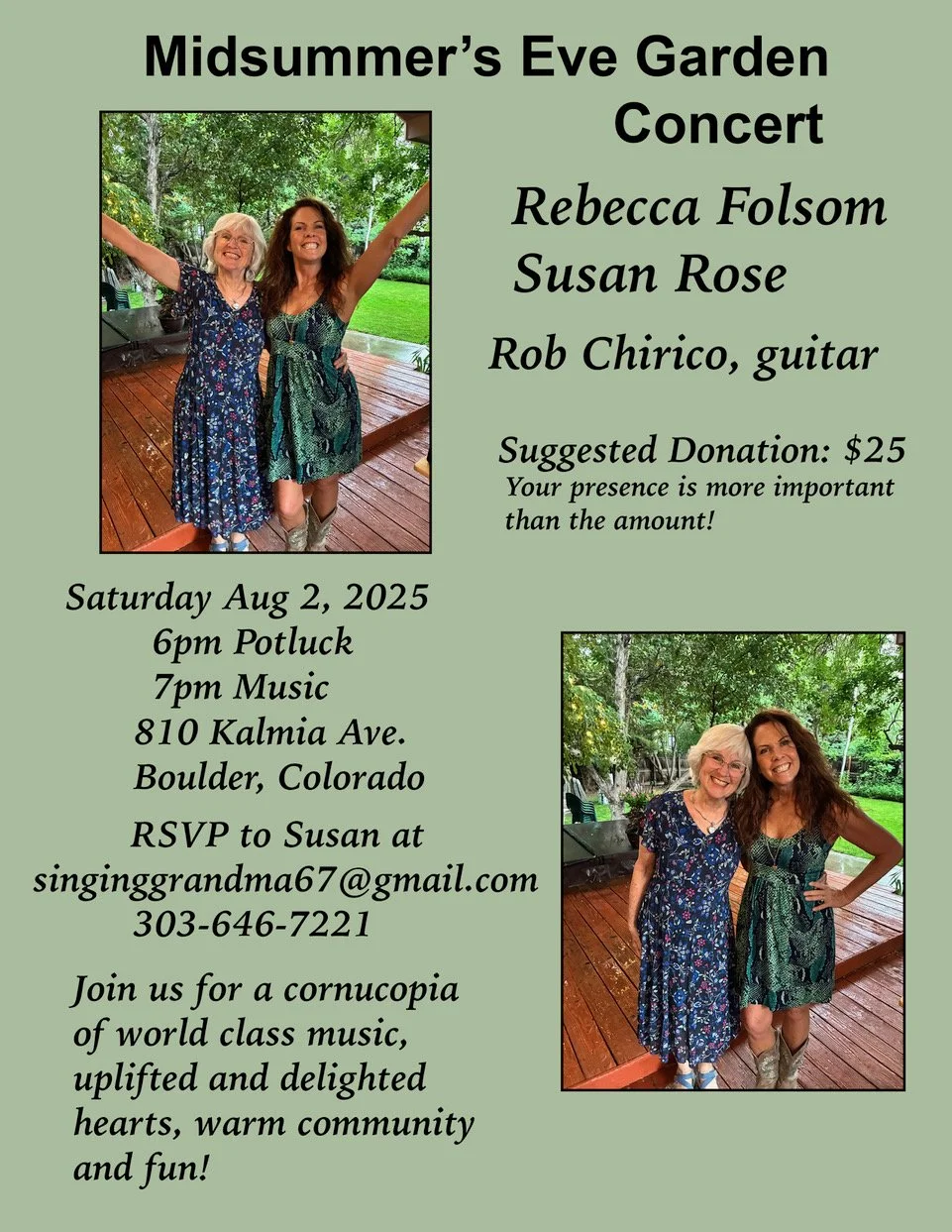 Rebecca Folsom & Susan Rose Garden Concert/Boulder, Colorado Saturday, August 2, 2025 7:00 PM 9:00 PM Boulder, Colorado (map) Google Calendar ICS Rebecca Folsom and Susan Rose perform at a Garden Concert in Boulder, CO. 6pm Potluck and 7pm Show. Email singinggrandma67@gmail.com to RSVP and more detailed information. $25 suggested donation