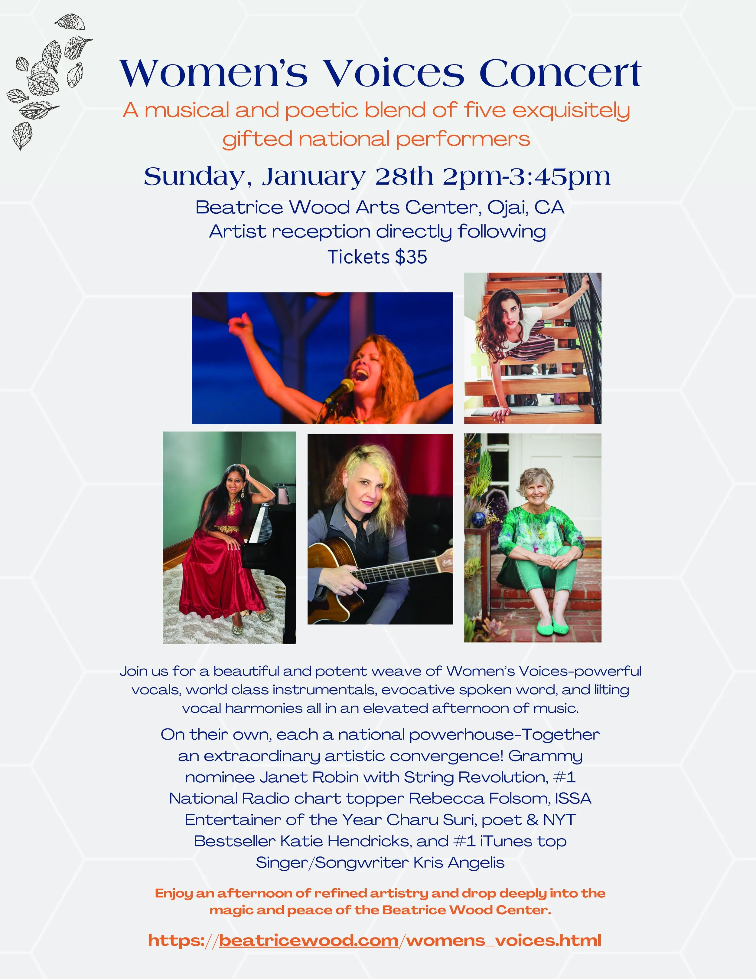A musical and poetic blend of five exquisitely gifted national performers. On their own each a powerhouse, together they create an artistic convergence altogether extraordinary! Grammy nominee Janet Robin with String Revolution, #1 National Radio chart topper Rebecca Folsom, ISSA Entertainer of the Year Charu Suri, poet & NYT Bestseller Katie Hendricks, and #1 iTunes top Singer/Songwriter Kris Angelis, will weave their talents to offer an exceptional afternoon of refined artistry! The show will be a combination of solo performances, innovative collaborations and rousing group numbers. Come enjoy this beautiful and potent weave of Women’s Voices!